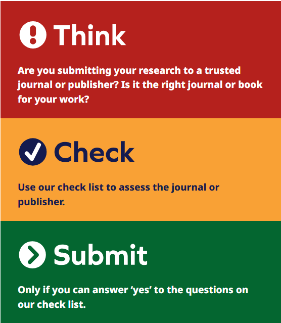 Hugsaðu, kannaðu, sendu inn er einfaldur tékklisti sem hjálpar þér að meta hvort tímarit og útgefandi sé traustverður eða ekki.